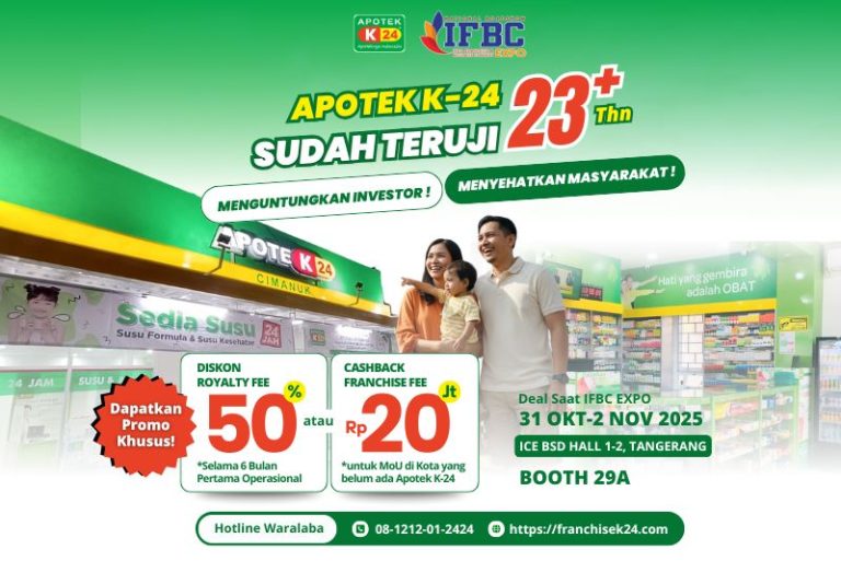 Bagi Anda yang mencari peluang investasi aman dengan brand yang kuat, inilah saatnya. Franchise Apotek K-24 mengundang Anda untuk menemukan peluang investasi ini langsung di IFBC Expo 2025 (Info Franchise & Business Concept Exhibition).