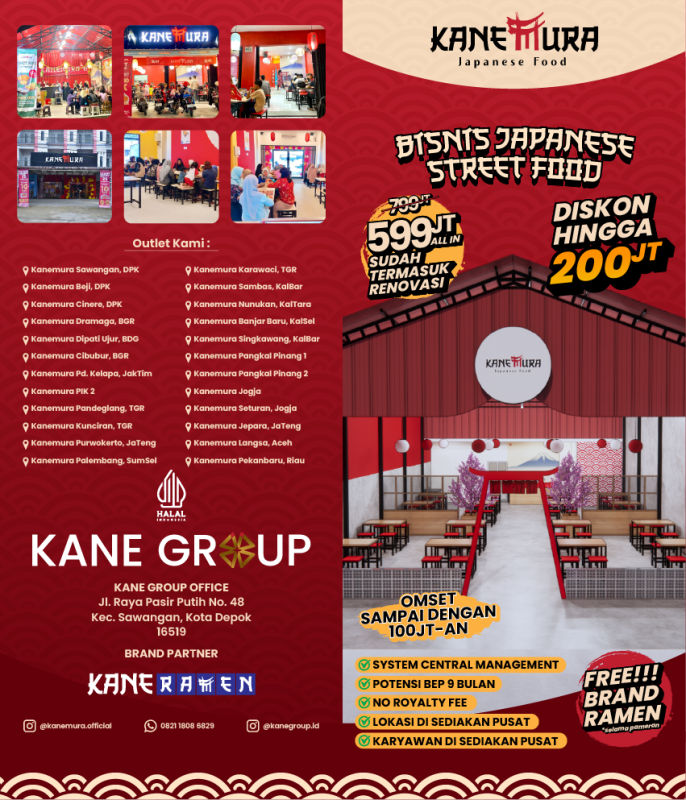 Selain itu, bagi mitra-mitra yang bergabung bersama KaneGroup akan dibantu untuk Pemasaran dengan strategi marketing Online & Offline, juga tim berpengalaman dari pusat untuk menunjang omzet dan brand awareness untuk Outlet-outlet KANEMURA dan KANERAMEN.